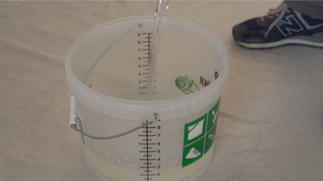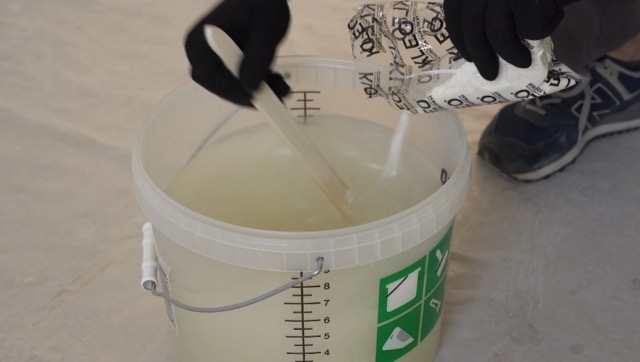3. Всыпьте клей: Не прекращая мешать, медленно и постепенно всыпайте содержимое пакета (или двух пакетов сразу) ближе к краю емкости, где вода движется активнее всего. Если высыпать всю смесь в центр и перестать мешать — комков не избежать. После высыпания всего клея в воду перемешивание нужно производить не более 30 секунд.